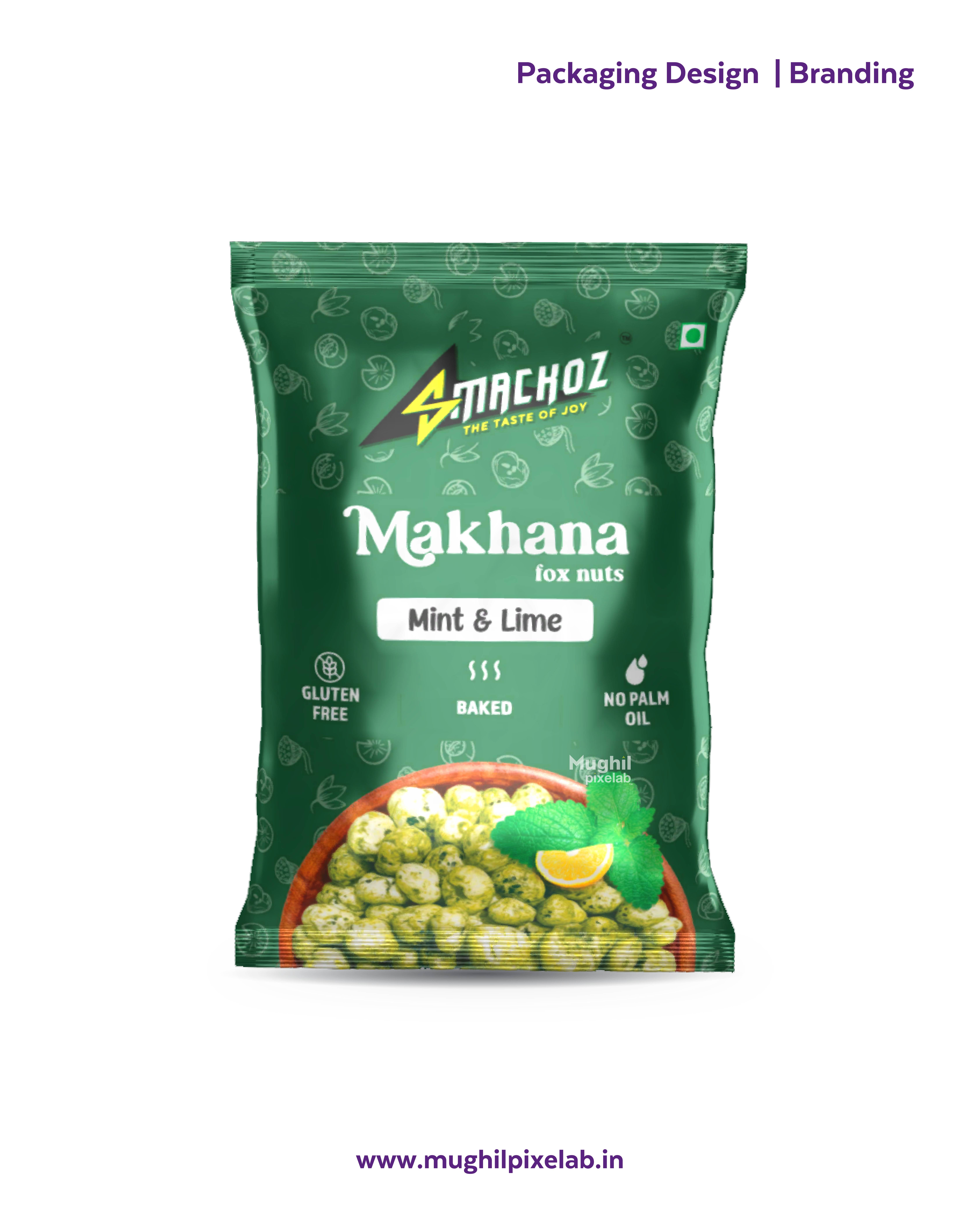 We developed a Makhana Foxnut Mint and lime Snack Pouch product packagefor the Smackoz brand, with six color cylinder combinations to enhance printing craftsmanship and color illumination. It was printed onto BOPP laminated film using a rotogravure printing technique.